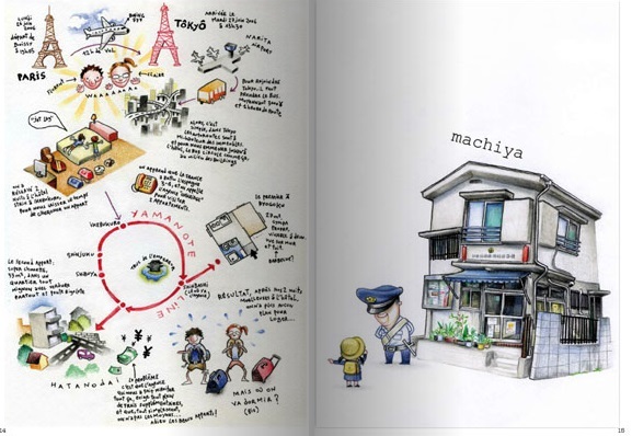 Oui. C’est à mi-chemin entre un carnet de voyage et un carnet de croquis – quand je dessinais là bas, je n’avais pas d’ambition autre que de faire un book éventuellement. Mes dessins originaux étaient sous la forme de deux carnets assez abîmés… Philippe Picquier a eu l’idée d’en faire une sorte de guide graphique de Tokyo, donc on les a réorganisés sur une base géographique, par quartiers, en suivant grosso modo le parcours de la ligne de train périphérique de « Yamanote »:http://fr.wikipedia.org/wiki/Ligne_Yamanote. J’ai rajouté des cartes, qui ont été faites en France, et les Kôban (« commissariats de quartier »:http://en.wikipedia.org/wiki/K%C5%8Dban, ndr), qui sont un peu le fil rouge du livre.