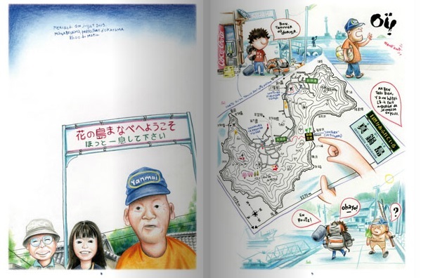 L’éditeur a envoyé des exemplaires à la moitié de l’île gracieusement, et comme l’autre moitié en voulait aussi c’est devenu compliqué on a leur fait des tarifs réduits ! Ils en sont très fiers ! Le livre est en vente sur l’île, on peut l’y acheter mais en français ! Bien sûr ils ne peuvent pas le lire, mais comme c’est assez expressif, presque comme de la BD, ils reconnaissent les situations, ils se reconnaissent, ça leur suffit pour se marrer. Aujourd’hui des touristes français y vont parce qu’ils ont lu le bouquin, chaque été il en vient un peu, peut-être 10 ou 20 par an. La semaine dernière j’ai reçu un mail de Natsumi Nakamuro, c’est elle qui s’occupe du courrier me disant qu’un groupe de français venait d’arriver dans l’île. Chaque fois que des français débarquent dans l’île, j’ai un rapport des habitants ! C’est marrant, maintenant ils sont habitués.