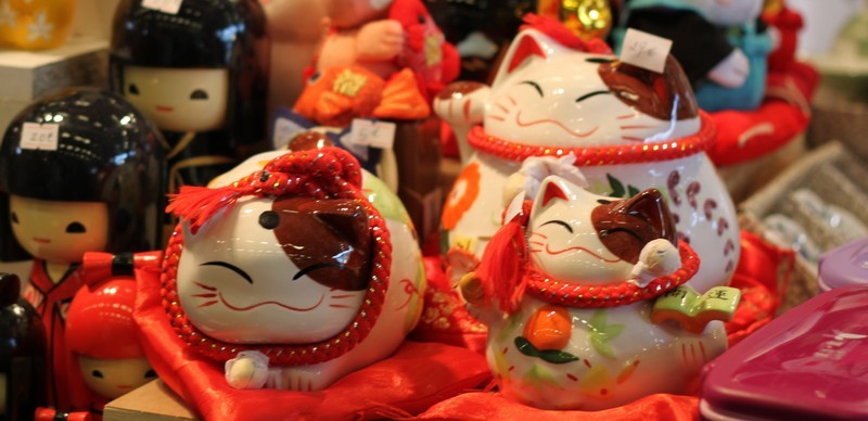 Le maneki neko est un chat à la patte levée qui « invite » celui qui croise son chemin, raison pour laquelle on en trouve souvent dans les magasins ou dans les entrées. Petit ou grand, patte droite ou gauche levée, une pièce d’argent ou pas, c’est un porte bonheur qui apporte la bonne fortune sur la maison qu’il protège. À Tokyo, le maneki neko, et le chat en général, est vénéré au temple Gotokuji.