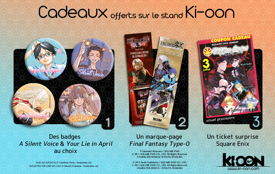 Pour la sortie de Final Fantasy – La Guerre de l’Epée de Glace, c’est un marque page qui vous sera offert. Des badges A Silent Voice et Your Lie in April, deux séries sorties cette année et qui rencontrent un succès non négligeable vous seront donnés pour l’achat d’un tome d’une des deux séries. C’est le grand retour des sacs géants et sacs tissus : pour l’achat de trois mangas, c’est Darwin’s Game, Last Hero ou bien encore Inuyashiki que vous pourrez transporter partout avec vous.