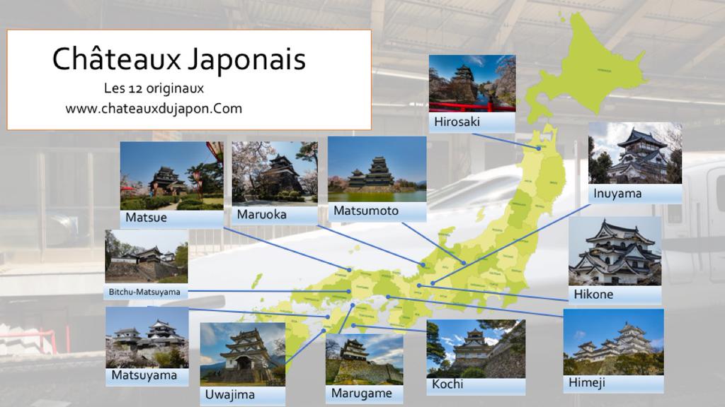 Les deux réalisateurs nous en recommandent surtout douze, qui ont la particularité de posséder toujours leur donjon en bois. Rendez-vous donc (du nord au sud) à Hirosaki, Matsumoto, Maruoka, Inuyama, Hikone, Himeji, Matsue, Bitchu-Matsuyama, Marugame, Matsuyama, Uwajima, et Kochi.