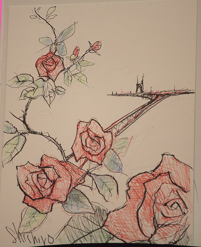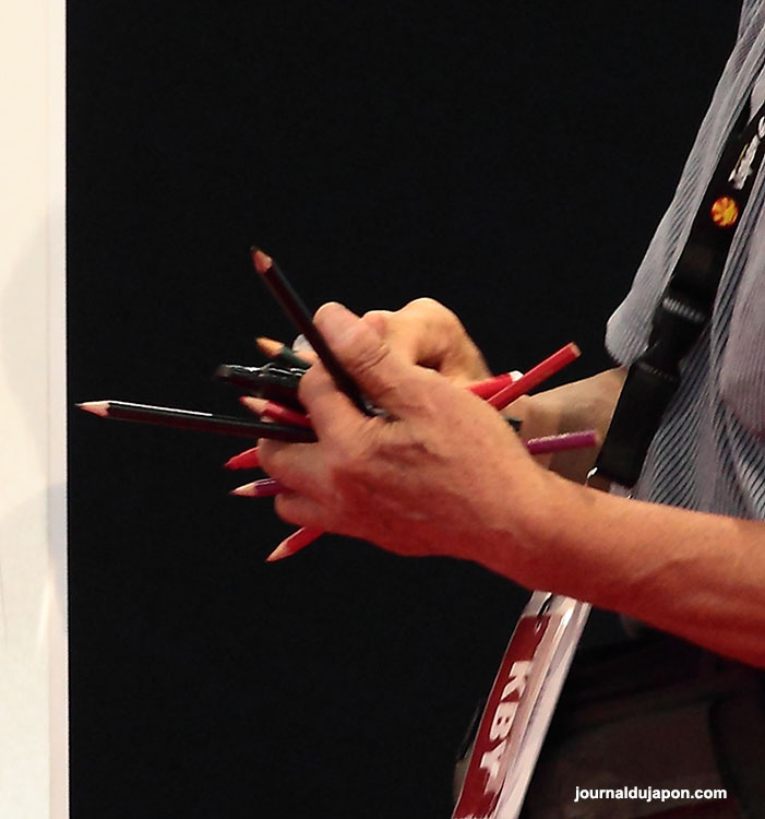 Quand il est question de citer ceux qui l’ont inspiré, Kobayashi n’hésite pas une seconde pour nommer Hokusai, maître de l’ukiyo-e, et Vincent Van Gogh. « En fait, c’est assez difficile d’expliquer ce qu’il en est, mais au début, j’avais un avis très mitigé sur eux. Cependant, je pense que dans chacune de leurs peintures se cache une espèce d’humanité, et c’est ce qui m’a beaucoup plu. Ce n’est pas vraiment une question de graphisme. Je pense malgré tout qu’ils ont eu un fort impact sur mon travail. » Sur le salon, il était d’ailleurs possible d’apprécier le résultat de son labeur grâce à une exposition qui lui était dédiée, et dont l’une des pièces centrales était un court film d’animation qu’il a réalisé : La sirène et les bougies rouges. « C’est une œuvre que je voulais faire depuis longtemps : lorsque j’étais à la campagne, il n’y avait rien d’autre que ce livre pour me distraire. Il représentait un moyen d’évasion unique, et je voulais lui rendre honneur. Cela peut sembler en marge de ma carrière, mais je voulais transmettre cette histoire et je ne le regrette pas. »