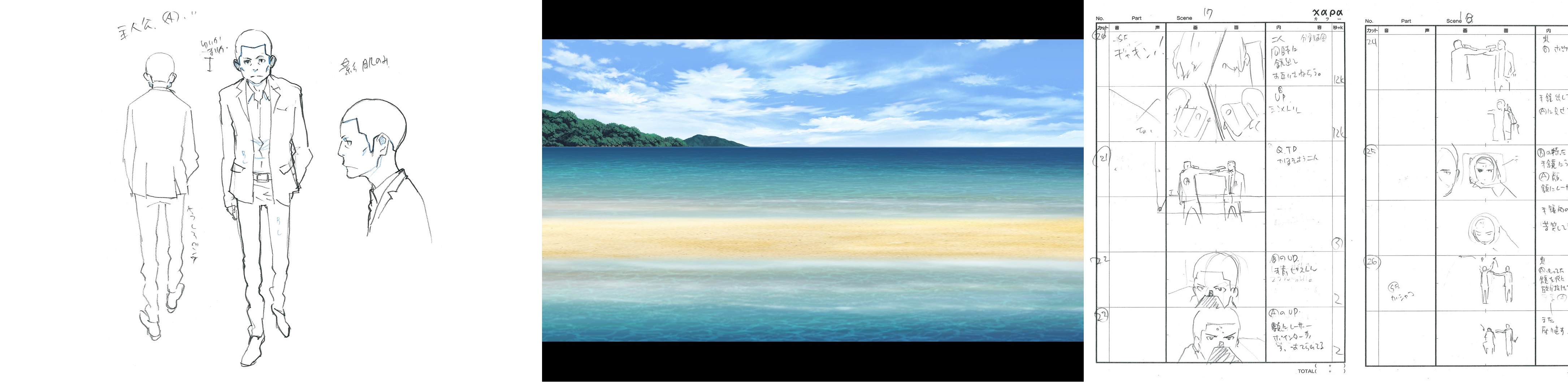 Les gens ayant suivi attentivement Space Dandy auront peut-être une impression de déjà-vu. Effectivement, Atsushi KAMIJO, qui signe ici le character design, a conçu le personnage de Johnny du mémorable épisode 20 de Space Dandy. Le traitement de l’image, à grand renfort d’effets de trame et de plans monocouleurs, y est également le même. Atsushi KAMIJO n’est cependant pas character designer de formation et à principalement publié des mangas dont Next Stop, paru en France chez Glénat.