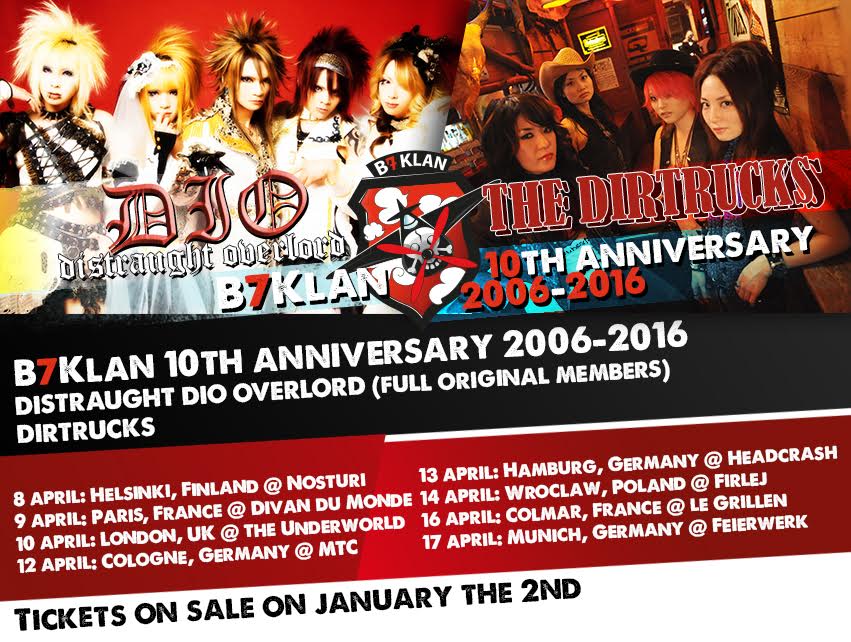 – B7KLAN organise pour son 10e anniversaire le 10th Anniversary Tour with DIO – DISTRAUGHT OVERLORD and DIRTRUCKS. Les deux groupes étaient déjà venus en France grâce à B7KLAN. C’est l’occasion pour DIO – DISTRAUGHT OVERLORD de se reformer après s’être séparé depuis 2010.