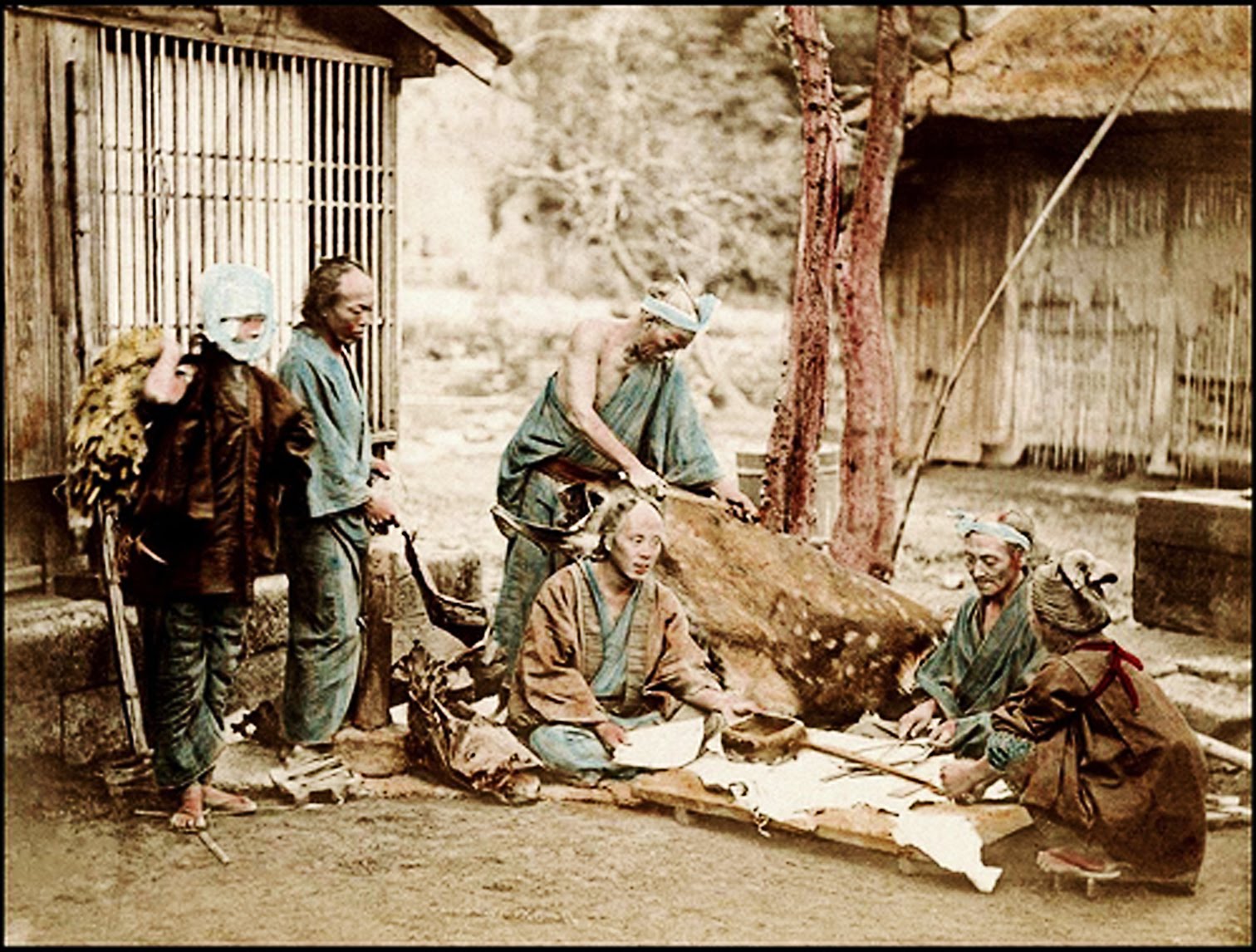 Cette discrimination étant liée au bouddhisme, il est possible d’en retrouver des traces jusqu’à l’ère de Nara (VIIIe siècle), mais c’est vraiment au début de l’ère d’Edo (1600-1868), que leur statut se formalisera avec la mise en place par Ieyasu TOKUGAWA du Shinôkôshô (士農工商), un système de caste qui lui survivra jusqu’à l’avènement de l’ère Meiji (1868-1912). Il s’agit d’une hiérarchie pyramidale comme on en trouve dans de nombreux pays, à la même époque, et dont la particularité est de stratifier les différentes populations japonaises selon leurs professions : les guerriers, (士), se situent au sommet, avec pour principal mission un devoir d’exemplarité ; les agriculteurs (農) viennent ensuite, puisqu’ils produisent le riz qui nourrit la nation japonaise ; viennent ensuite les artisans (工) et enfin, en bas de la pyramide, les marchands (商), souvent mal vus parce que leur activité ne produit rien, mais se concentre sur la revente, ce qui était à l’époque souvent confondu avec une forme de parasitisme.