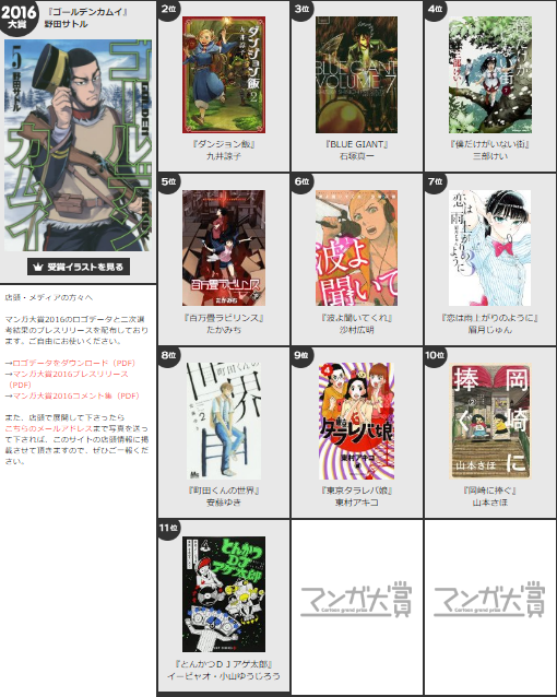 Une belle et riche sélection 2016 qui couvre de nombreux thèmes, arbore des styles bien distincts et maintient un haut degré de qualité quant aux récits proposés. Au milieu de ces candidats, la rédaction de JDJ prend les paris et mise sur Erased, Blue Giant ou Golden Kamui… Un avis subjectif bien entendu car potentiellement, chaque titre peut croire en ses chances. Cela dépendra des attentes du jury.