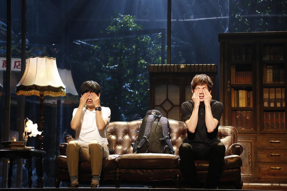 L’avantage de ce dispositif est double : bien sûr, le premier est d’ordre pratique, le passage d’une section à l’autre de l’histoire se faisant rapidement, en déplaçant quelques boites. Quant au second il est plutôt esthétique, les changements de scène prenant l’aspect d’un hypnotique et minutieux ballet d’hommes en noirs et de décors glissant sur la scène. Toujours à ce sujet, il convient aussi de noter et saluer le formidable travail de Tsukasa NAKAGOSHI, à l’origine de la scénographie et qui a réuni, pour la pièce, les plus somptueux décors. Chaque boîte, en effet, est un trésor d’invention, au symbolisme éloquent. Un banc cassé pour figurer une retraite dans la montagne, quelques néons pour un hôtel, des arbres touffus pour la forêt, des rayonnages débordants de livre pour une bibliothèque, chaque décor est une œuvre d’art en soi. Surtout, chaque bloc respire la vie, donnant à la pièce un côté sensible. De l’écriture de MURAKAMI, on dit souvent qu’elle déborde de marques, et que ces dernières contribuent à ancrer ses œuvres dans un réel familier, parce que parler des Ray-ban que porte son personnage ou du paquet de Camel qu’il fume, c’est s’assurer que le monde entier puisse se le figurer. Et la minutie avec laquelle NAKAGOSHI a conçu les décors répond à la même dynamique, rendant visibles et concrets la réalité et le réalisme de la pièce, plaçant le spectateur dans un monde familier.