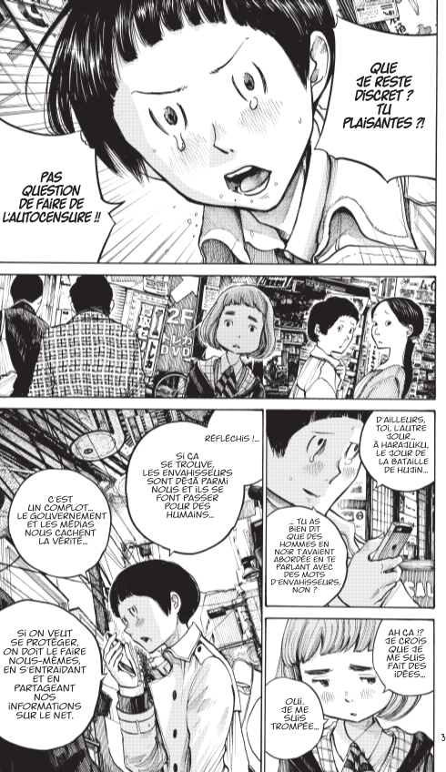 Et pour finir par la fin : le dernier tome montre de nouveaux points de vue vis-à-vis de la catastrophe: celui de personnes qui ne sont pas au courant des événements, et de celles vivant en dehors de Tokyo, et se cachant dans des lieux abandonnés. Cette conclusion montre, tout comme les précédents tomes, un monde certes envahi par des extra-terrestres, ce qui a engendré des radiations mortelles pour les humains, mais qui nous rappelle encore une fois la catastrophe de Fukushima à travers les » astérisques ». qui sont des particules de lumières qui tombent sur le sol comme de la pluie et extrêmement dangereuses : si elles nous touchent, la partie de notre corps qui a été en contact s’évapore. D’un autre côté, les conflits deviennent de plus en plus violents puisque les groupes ont pu obtenir des soutiens financiers, se sont armés et se retrouvent dans des QG.