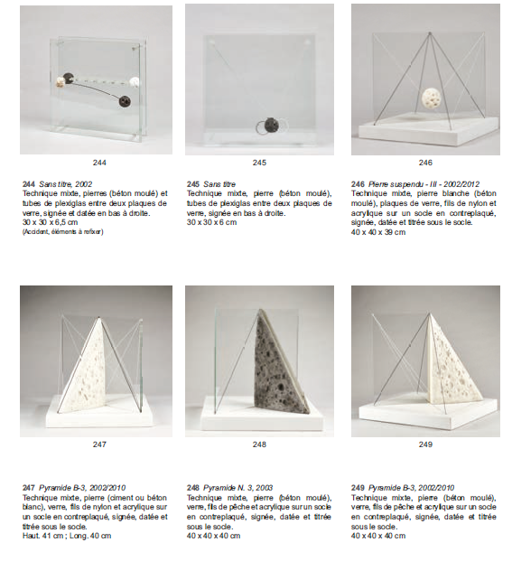 MSS : J’aime beaucoup ses pyramides (lots 247 et 248 entre autres). Je les trouve poétiques et elles résument bien le travail de l’artiste. On retrouve l’opposition entre la légèreté et la pesanteur, le blanc et le noir, la transparence et l’opacité, l’illusion d’optique, l’intégration de matières, et tout ce que représente la pyramide : une forme géométrique, un monument ancestral et majestueux, la perfection et l’équilibre de la forme.