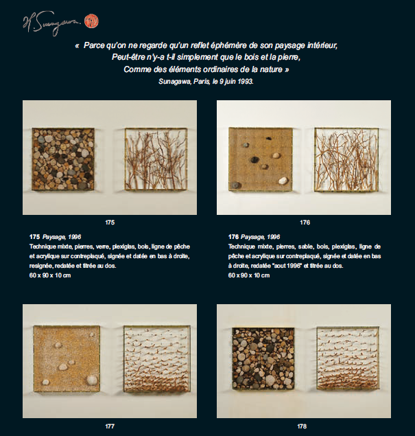 MSS : Rigueur, passion, renouveau, poésie de la nature, esthétisme et pureté. SUNAGAWA s’est réinventé en France, et il n’a cessé de réaliser une synthèse artistique entre la culture japonaise et la culture française et plus généralement européenne. Il avait beaucoup d’amis, dans le monde de l’art, de la musique, et en même temps il vivait tel un moine artiste, reclus dans son atelier avec sa création.