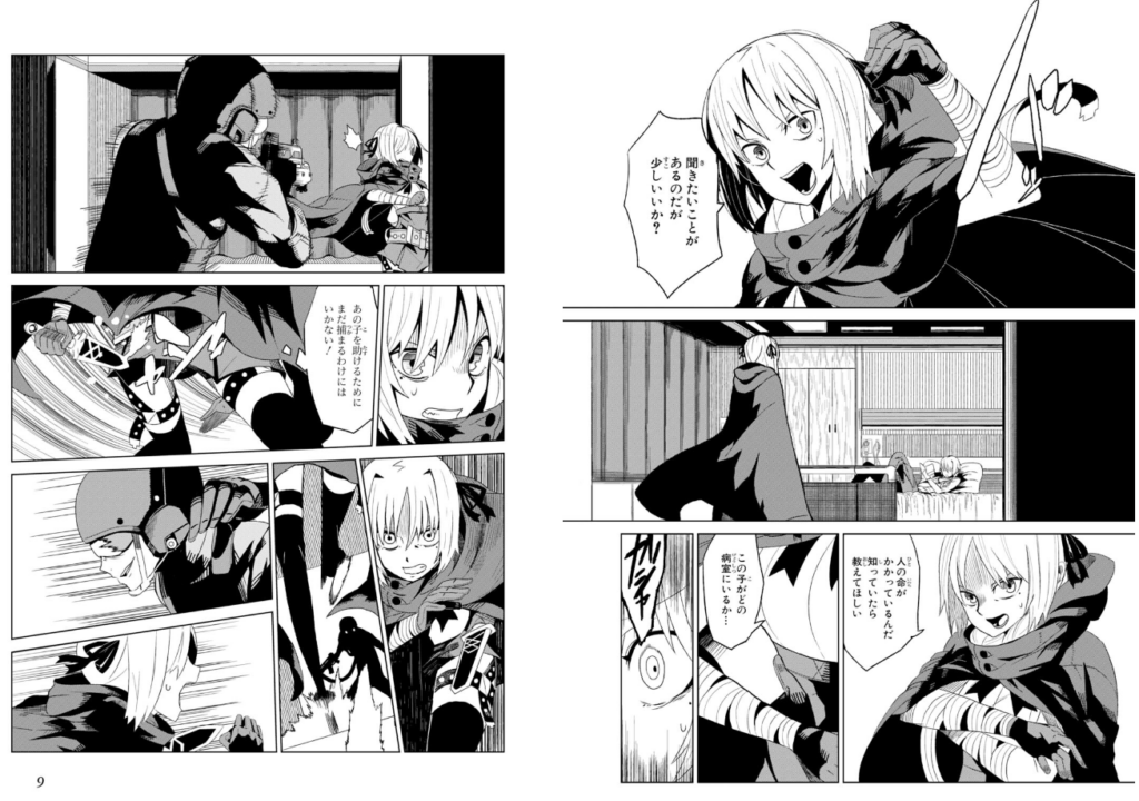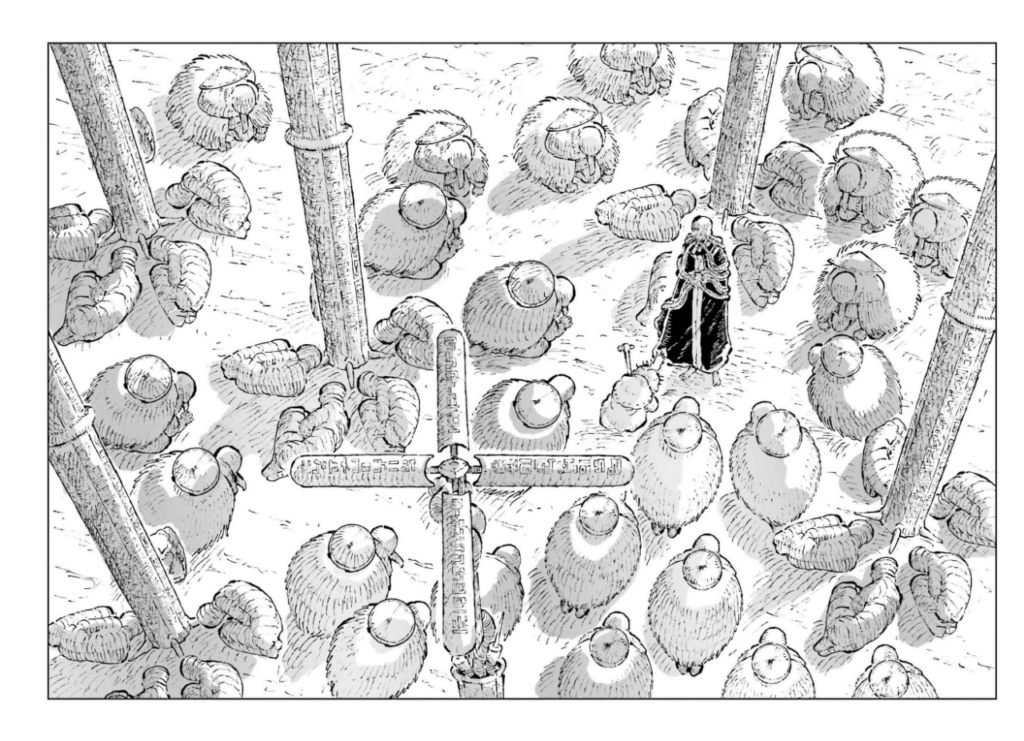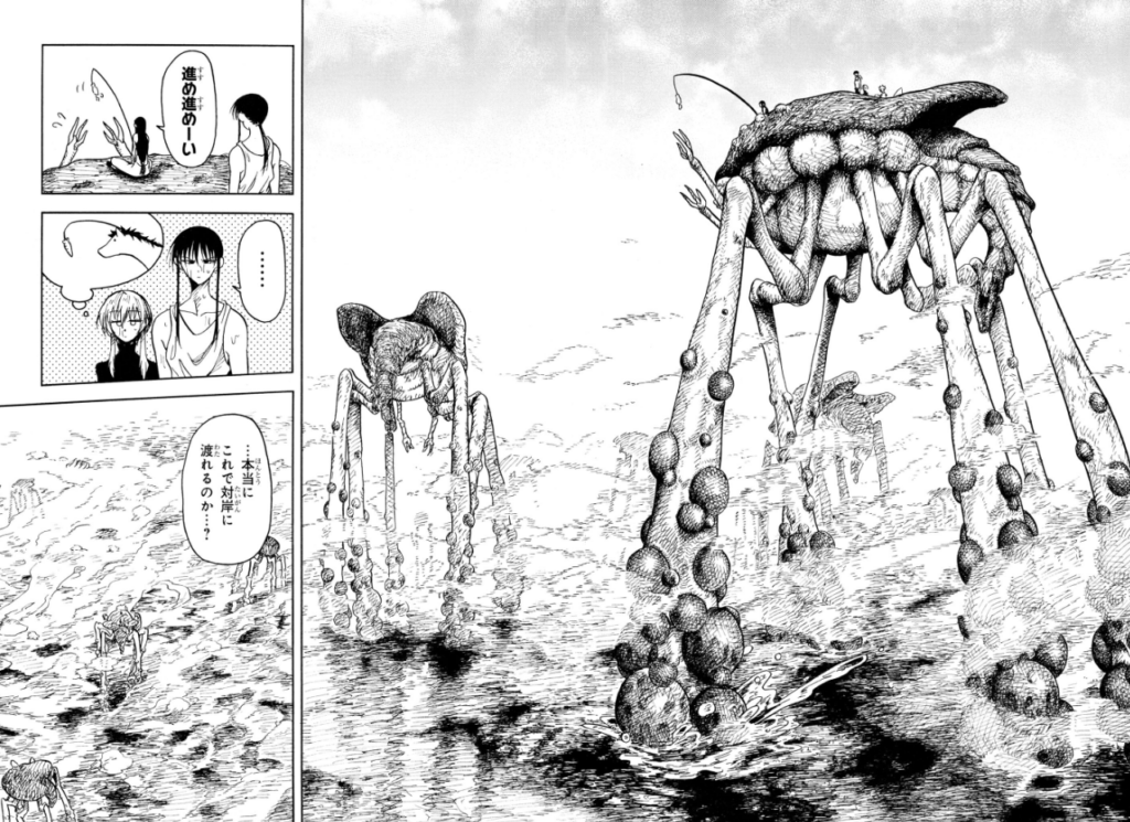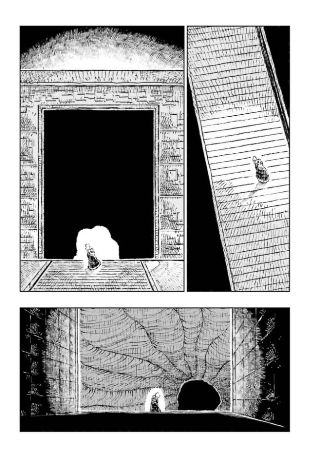 Yamaji Arata fait un choix courageux ici. Le lecteur découvre un monde mystérieux, opaque et ne le comprend, ne le devine, qu’à travers des bribes d’informations lâchées aux détours d’une conversation entre deux personnages, de fresques sur le mur ou d’architecture étrange. Cela pourrait décontenancer, nous perdre, mais à chaque page nous découvrons quelque chose de nouveau, nous sommes encore plus attirés par cet univers. C’est une sensation enivrante qui ne s’épuise jamais. Le/la mangaka nous propose ici une expérience de lecture puissante. De plus, les dessins fourmillent de petits traits, façonnant un univers avec une utilisation du noir et blanc très particulière. Les dessins eux-mêmes reflètent parfaitement le monde et ne peuvent donner naissance qu’à ce monde. C’est un accomplissement fabuleux. Il faut aussi savoir que l’encrage a été modifié entre les premiers chapitres, dans les magazines, et la version reliée. Lorsque nous avons interrogé l’auteur/trice à ce propos, il/elle a répondu avoir modifié l’encrage afin de rendre l’apparence du monde plus « cool » (« かっこよく »).