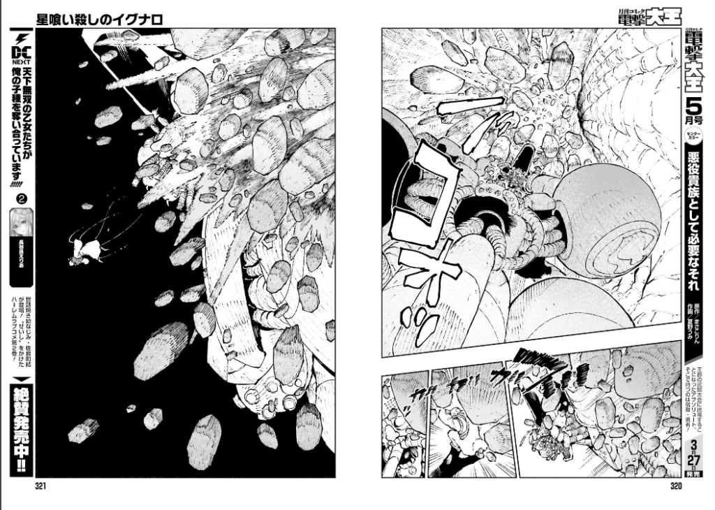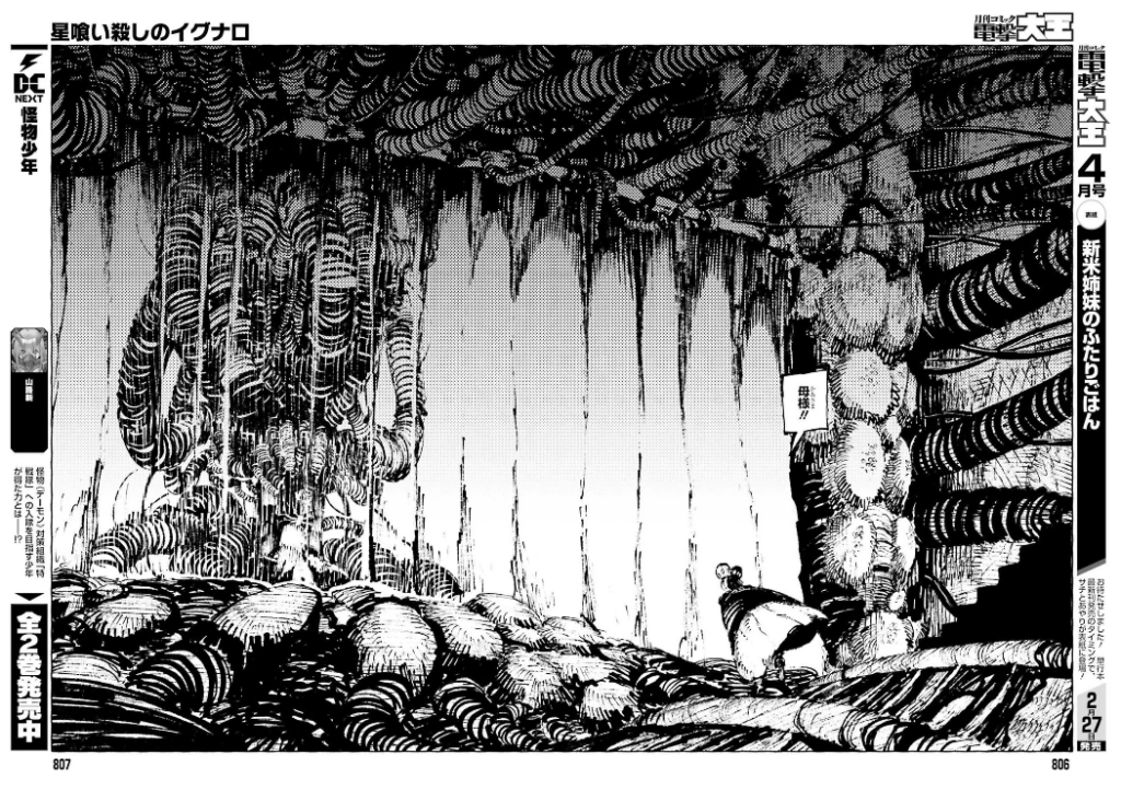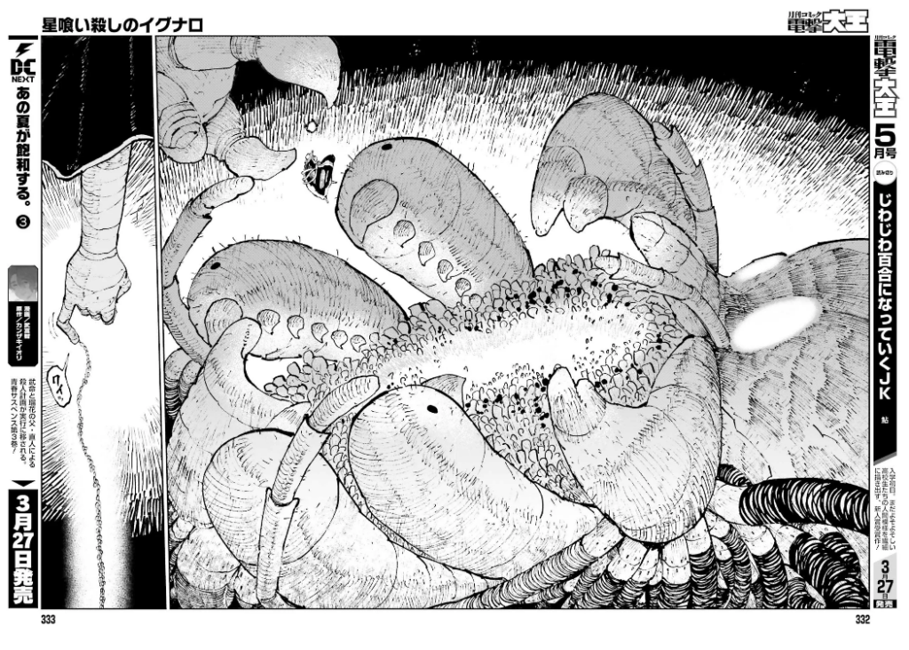 Seulement un an plus tard, il/elle commence le manga dont il est question ici, à savoir Hoshi-kui Killer Ignalo, toujours chez Kadokawa : des individus dotés d’étranges masques creusent sans cesse dans l’espoir de trouver de la nourriture. Mais rien n’y fait et le désespoir les gagne… Jusqu’au jour où un soldat apparaît, missionné dit-il par un mystérieux Empire. Il recherche un exosquelette qui serait enfoui mais, hélas, personne ne peut l’aider. Il va tout de même les accompagner lors de leur sortie, car il a aperçu un nid et cela intéresse beaucoup les mineurs. Mais tout va se compliquer lorsqu’ils vont tomber non pas sur un, mais sur deux exosquelettes. Tout semble perdu, mais le soldat parvient à prendre possession, grâce à des insectes, du monstre.