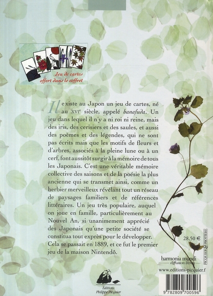 Le jeu de hanafuda, est un jeu de cartes populaire qui s’inscrit dans la tradition japonaise. Il fait appel à des références littéraires anciennes représentées par des dessins sur les cartes, le but étant de les réunir par paires en respectant une certaine harmonie. Le livre Le Jeu des Fleurs, réalisé par Véronique Brindeau et illustré par Frédéric Clément, contient un jeu de 48 cartes réparties en 12 séries de 4 cartes et 12 textes. Chaque texte, chaque série représente un mois de l’année, lui-même associé à un végétal, et raconte une histoire.
