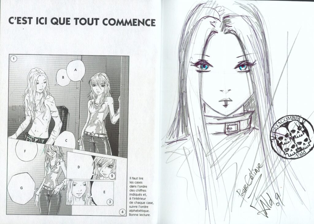 En ce qui me concerne, je prends plaisir à balancer quelques références tout au long du manga, comme des t-shirts, des inscriptions sur les murs, etc. C’était aussi pour casser le côté un peu goth de l’histoire. Si les lecteurs ont la curiosité d’aller sur le myspace dédié au groupe Katacombes, de regarder la liste des amis, écouter les morceaux, ils verront qu’on est pas seulement dans un délire goth, « sombre obscur », mais plutôt métal et qu’il y a une volonté de planter un décor, mettre une ambiance.