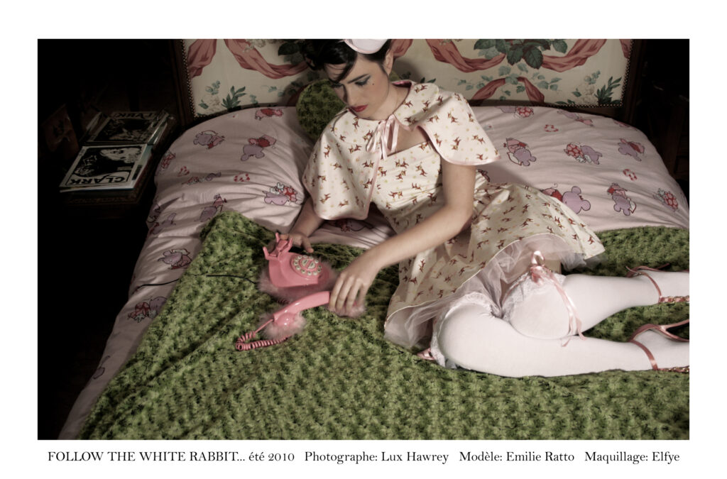 Cette approche tout à fait personnelle de la mode tokyoïte Harajuku, c’est la créatrice française Candice qui l’a développé et avec qui nous avons pu échanger. La jeune femme est née dans une famille américano-franco-thaïlandaise de créateur.ices, de parents artiste-peintres, d’un père dessinateur de bijoux, d’un grand-père ancien collectionneur d’art contemporain. Autant dire qu’elle a toujours baigné dans l’art. C’est logiquement qu’elle se tourne vers des études de stylisme-modélisme et intègre la célèbre école Esmod (École supérieure des arts et techniques de la mode) à Paris. « En sortant, j’ai tout de suite su que je voulais créer mes propres vêtements », nous explique Candice. Ce qu’elle fait en 2007 avec la marque « Follow the white rabbit… » (Suivez le lapin blanc) suite à son coup de cœur pour la mode japonaise. Une mode où il n’y a a priori pas de règles, sauf celle « d’oser et de s’amuser » d’après la créatrice.