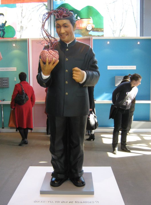 En entrant dans la salle principale de l’exposition Beat Takeshi Kitano, Gosse de peintre, on tombe nez-à-nez devant un mannequin qui représente Beat Takeshi regardant son propre cerveau et s’interrogeant : « Qui es-tu, toi qui me regardes ?! » Cet auto-portrait fait référence à l’accident de moto survenu en 1994 et à la suite duquel Kitano avait refusé une craniotomie. « C’est sûr, en découvrant mes tableaux, mon chirurgien va penser qu’il aurait dû m’opérer ! » s’exclame-t-il en nous faisant faire le tour du propriétaire. Le ton est donné !