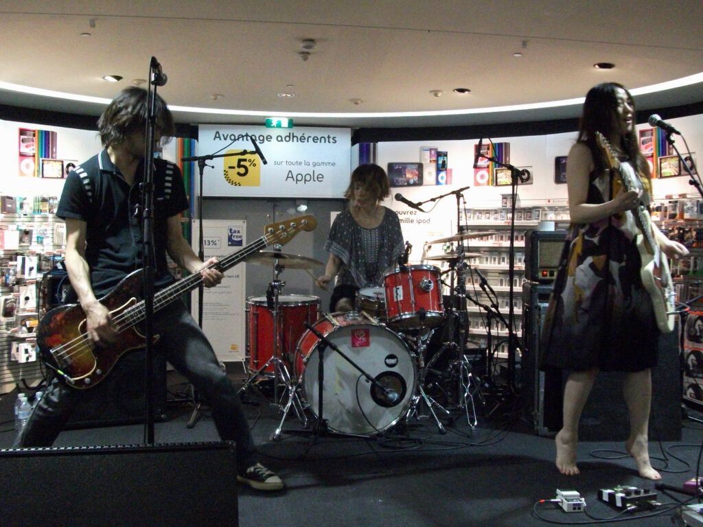 Ce fut une journée bien remplie pour le groupe japonais punk-garage detroit7. Le 29 mars dernier, le trio était en showcase et en dédicace à la Fnac des Champs-Élysées, puis en concert au Klub à Paris. Un programme chargé qui ne leur a pas fait peur. Les deux spectacles se sont enchaînés sans accroc.