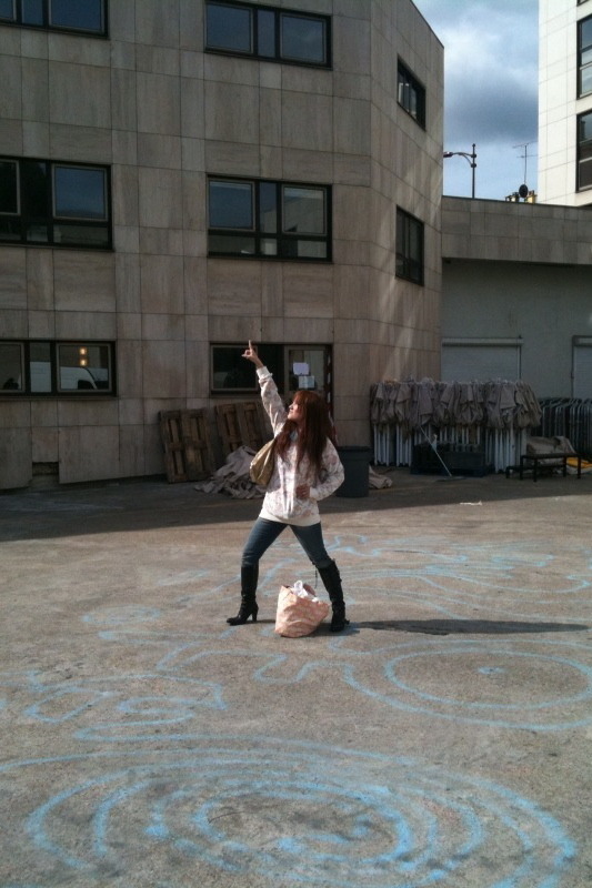 Un merveilleux cadeau. Tout comme cette photo (ci-dessous), qu’elle a prise le lundi matin avant de repartir au Japon. Elle reproduit la pose de Haruhi à la fin de la danse du Hare Hare Yukai sur les inscriptions que les fans avaient tracées au sol au milieu de la cour de l’Epita.