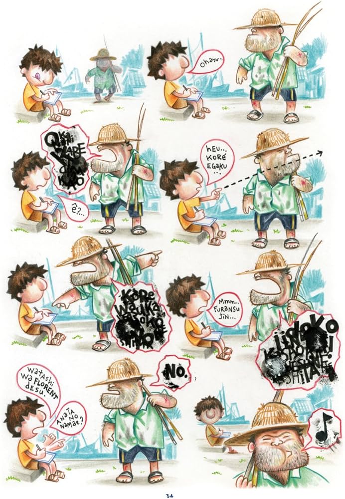 D’abord surpris par cet engouement que leur a porté notre auteur, tous et toutes se sont laissé.es séduire par son projet à savoir réaliser une cartographie de leur village. « Au début, les habitants ne comprenaient pas pourquoi je restais là et je n’allais pas sur l’île d’à côté plus touristique, avec ses hôtels, ses jet ski etc., raconte Florent Chavouet avec qui nous avons pu échanger. Pour eux, leur île et leur vie n’avaient aucun intérêt. » Mais c’est justement ça que l’illustrateur cherchait, faire une photo authentique (et comique) de leur quotidien à la fois sauvage et son contraire.