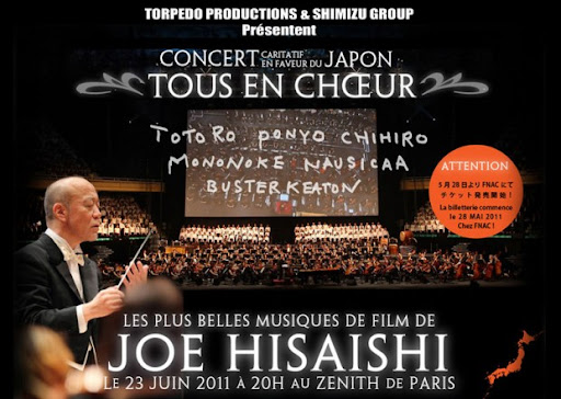 Rappelons que c’est dans de tristes circonstances que nous avons pu assister à ce concert le jeudi 23 juin 2011 au Zénith de Paris, une première en France. Le compositeur a en effet donné une série de concerts caritatifs à Tokyo, Osaka, Paris et Beijing pour encourager l’aide à la reconstruction des zones sinistrées au Japon suite au séisme et au tsunami qui ont sévit le 11 mars dernier. Les fonds récoltés par le projet : Joe Hisaishi 3.11 Charity Concert ~The Best of Cinema Music~, ont été investis dans des instruments musicaux pour les enfants des régions touchées par le drame.