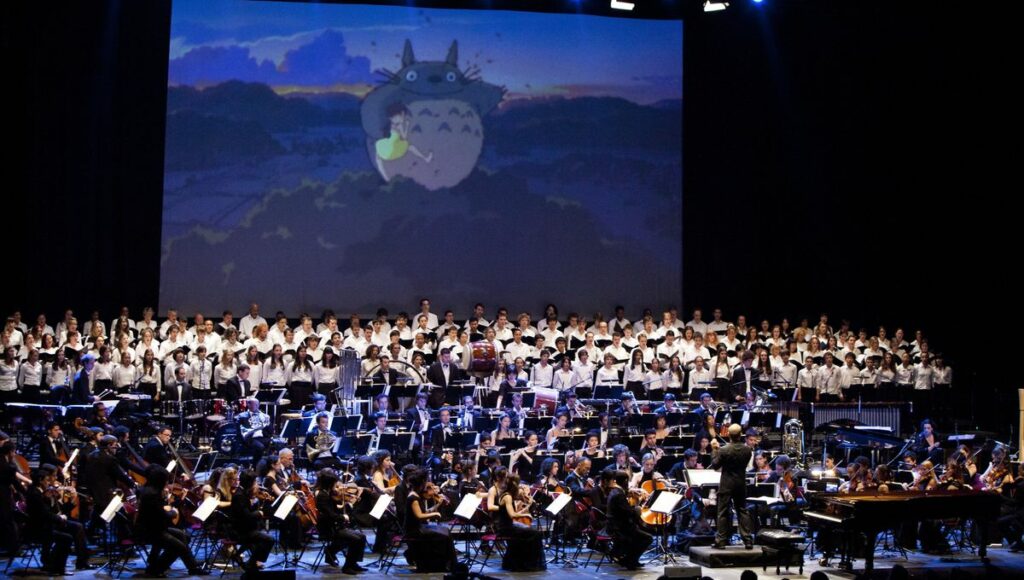 Bonne surprise de la soirée, un montage des images des films dont l’orchestre joue la musique alternant avec celles du concert est projeté sur l’écran géant, rendant le show d’autant plus intense. Une mise en scène à laquelle on aura droit tout au long du spectacle. C’est sur Princesse Mononoké qu’on entend une première fois la soprano Hélène Bernardy et qu’on comprend que les chants se feront en anglais et non en japonais. Pour certains, malgré la prestation remarquable des chanteurs, ça sera la grande déception. On entendra cependant peu les chœurs, sur Ponyo sur la Falaise et pendant le rappel et la cantatrice ne chantera qu’une fois de plus sur Your Story, extrait de la bande originale du film Akunin.