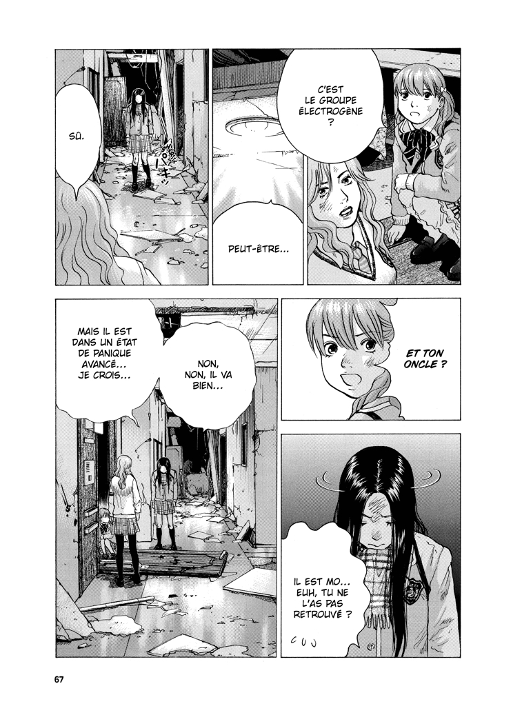 Avant d’être un scénario catastrophe, Sprite peut être vu comme une épopée humaine. L’intérêt que l’on porte à l’intrigue repose en effet en grande partie sur ses personnages. Stéréotypés au point d’en être presque caricaturaux dans les chapitres introductifs (la lycéenne énergique et un peu folle, sa camarade timide et angoissée, le voisin âgé et dévoué…), les personnages gagnent en profondeur dès le deuxième volume. Et on comprend assez vite que chacun d’entre eux cache une part d’ombre, qui nous est généralement révélée par un flashback particulièrement judicieux. Ishikawa prend soin de faire grimper le mystère autour de ses protagonistes principaux : Tsushima, ancien yakuza, et probable junkie, est ainsi hanté par de drôles de visions, Shôgo semble en savoir plus sur le temps que la plupart de ses semblables, tandis que Yû, dont le passé traumatique nous est révélé assez rapidement, semble cacher une facette particulièrement violente. On la sent souvent prête à tuer ceux qui se mettent sur sa route (comme les odieux jumeaux, voisins de Shôgo), et cette dimension maléfique du personnage nous amène évidemment à nous interroger sur les passages où l’héroïne apparaît sous la forme d’un ange. Simples hallucinations de Tsushima ou véritable tenant scénaristique ? Ce genre d’interrogation contribue à notre attachement aux personnages, dont on suit de près les réactions vis-à-vis des drames qu’ils subissent dans le Fujimidai de 2059 alors qu’ils ont souvent vécu des tragédies bien plus graves par le passé.