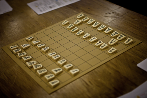 Très proche des échecs que nous connaissons, le shôgi oppose deux joueurs sur un plateau de 9×9 cases. Les joueurs disposent de 20 pièces chacun parmi lesquelles on retrouve la tour ou le fou des échecs occidentaux mais également d’autres types de pièces comme la lance qui se dirige du nombre de cases voulue mais seulement verticalement et vers le camp adverse ou le général d’or qui a les même déplacements qu’un roi sans les diagonales arrières. Lorsqu’une pièce arrive dans le camp ennemi (les trois dernière lignes), le quitte ou se déplace à l’intérieur, celle-ci peut choisir d’être promue. Elle est alors retournée pour dévoiler son autre face, en rouge. Par exemple, une fois promue, la tour se transforme en dragon et peu alors se déplacer d’une case en diagonale tout en gardant ses déplacements habituels.