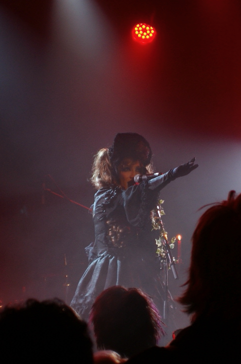 Comme prévu, le public a pu investir la salle de concert à 19 h. Celle-ci ne se remplira qu’à moitié mais peu importe. Ceux qui sont là savent accueillir. Une banderole, confectionnée et accrochée au balcon par les fans, attend les artistes. Entre les chandeliers et les roses, l’ambiance est très baroque. Kaya arrive sur scène vêtu de sa plus belle robe noire tout en dansant sur la musique d’introduction puis entame le morceau Kaleidoscope. Vont suivre, les titres Vampire Requiem ou Kugutu, mais surtout Chocolat, morceau largement sollicité par une foule énergique. Le choix de la setlist n’est pas optimal pour le chanteur et l’engouement du public retombera parfois.