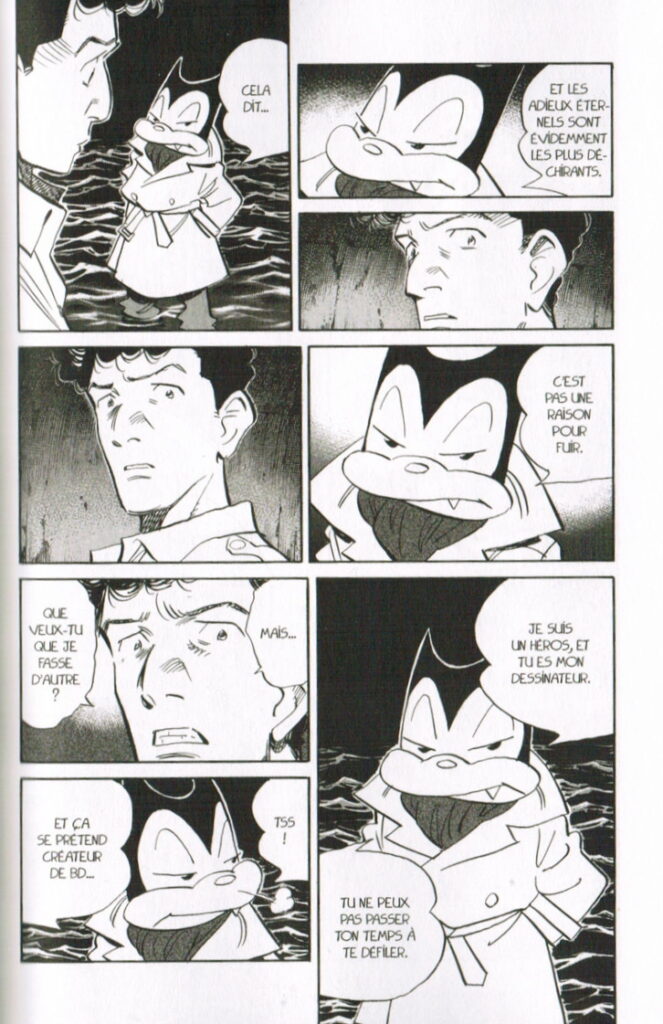 Toutes ces interrogations nous captivent et nous amènent à nous attacher à la chauve-souris. Son apparence atypique permet par ailleurs à Urasawa de s’expérimenter à différents jeux graphiques. Billy peut ainsi apparaître sous sa forme cartoonesque dans un monde on ne peut plus réaliste, ou bien directement en couleur sous la plume de Yamagata, ou encore en se dédoublant à travers deux entités pour mieux faire ressortir son rôle de conscience externe.