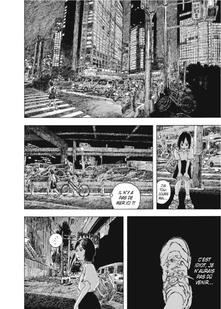 Si l’intrigue des Enfants de la mer met un peu de temps à se mettre en place, on se trouve en revanche immédiatement conquis par le graphisme du manga. Le style bien particulier d’Igarashi est proprement fascinant : à mi-chemin entre le crayonné et une reproduction détaillée de la réalité, ses planches dégagent toutes un certain cachet, au point que l’on se surprend souvent à passer du temps sur chaque case, ou encore à revenir quelques pages en arrière pour le simple plaisir d’admirer certaines scènes. Le monde mi-urbain, mi-maritime dépeint par Igarashi est criant de réalisme. Ce qui ne le rend pas pour autant dépourvu d’un lyrisme envoûtant : l’odeur de la mer, le parfum bien particulier des vacances d’été, le bruit des grillons… on a l’impression de respirer ces senteurs et d’entendre ces sons tant les planches d’Igarashi sont saisissantes.