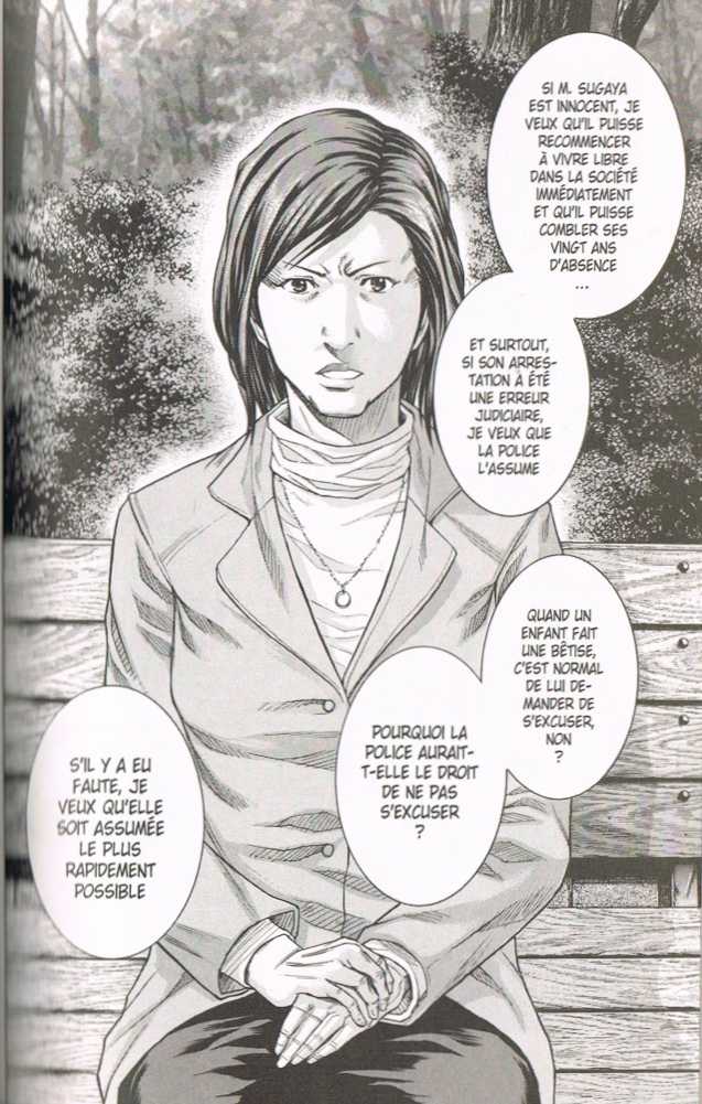 L’affaire Sugaya est un manga particulièrement émouvant puisqu’on pense aux victimes d’un tueur en série toujours libre et à la vie détruite de ce M. Sugaya. Mais aussi parce qu’on réalise qu’il y a toujours de l’espoir. M. Sugaya s’est retrouvé seul pendant des années dans son combat pour la liberté. Une lutte qu’il a finalement remportée grâce au soutien de journalistes (et même de la maman de l’enfant dont il a été accusé du meurtre) qui avaient à cœur de faire leur métier jusqu’au bout. Mais si l’affaire Sugaya est bel et bien classée, celle des fillettes du Kita-Kento est toujours ouverte. Et les journalistes continuent leur investigation.