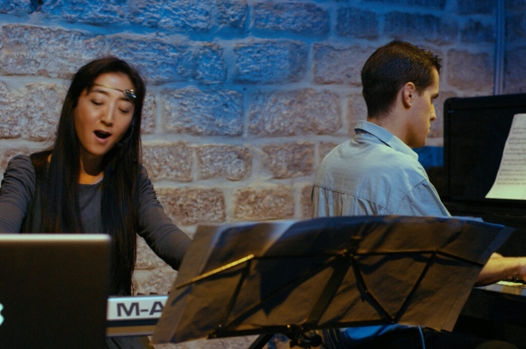 La taille de la salle n’empêche cependant pas un peu d’interactivité : Yuyutopia arrive dans la salle en chantant, introduit son concert et met l’accent sur l’histoire qu’elle raconte. Entre deux morceaux, elle fait le choix de nous parler de son voyage initiatique et métaphorique, une mini-odyssée qu’on devine inspirée de faits personnels. Chaque chanson − toutes extraites d’Aqua Shift, son premier album − ont pour rôle d’incarner une étape de ce voyage, de s’approprier une couleur et une ambiance bien particulière. Le choix est ici évident : l’eau, les couleurs froides, les ambiances éthérées… en ce qui concerne le matériel, le duo s’appuie aussi sur une dualité de sons : piano bien naturel et clavier électronique, Macbook fièrement posé pour les sons de fond, partitions pour le fil directeur. Cette confluence des genres donne une musique assez mixte, cela dépend parfois des morceaux.
