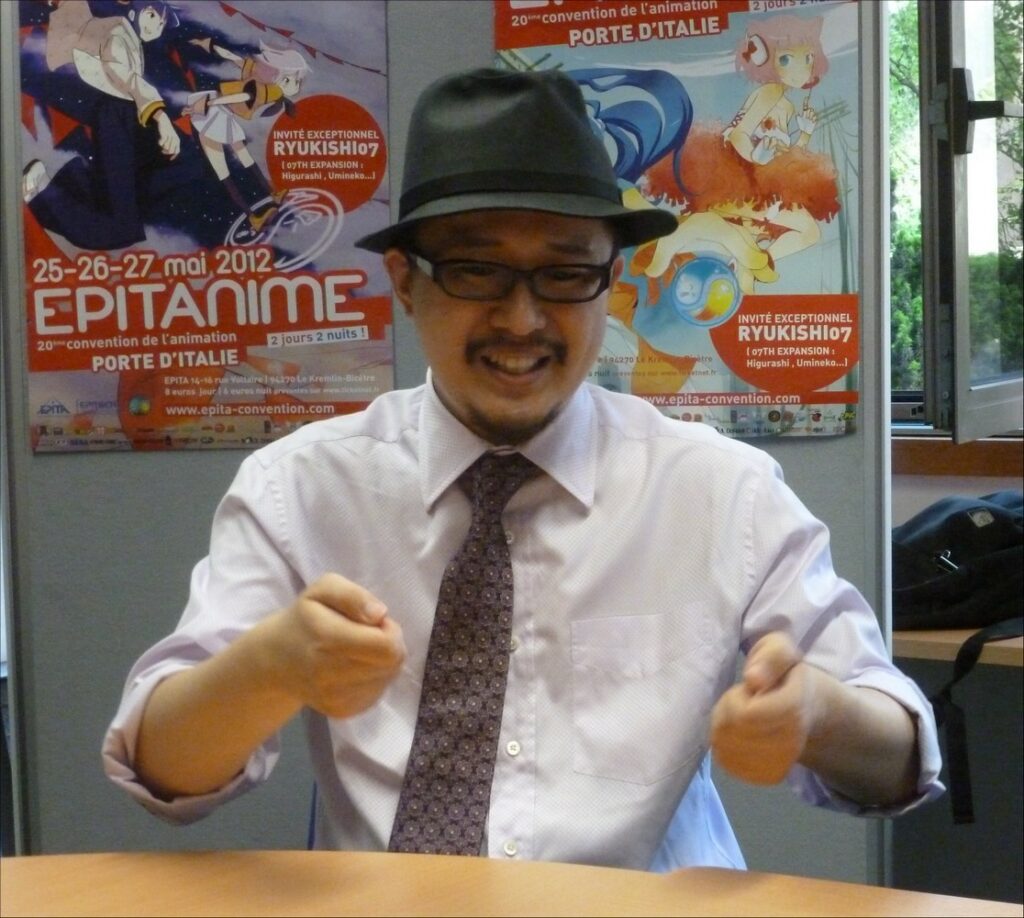 Ryukishi07 : À tous les Français : enchanté ! Je m’appelle Ryukishi07 ! Je produis les visual novel Higurashi No Naku Koro Ni, Umineko No Naku Koro Ni, bref la saga When They Cry. J’aimerais pouvoir appeler ça « sound novel » mais c’est une marque déposée au Japon, tout comme « visual novel ».