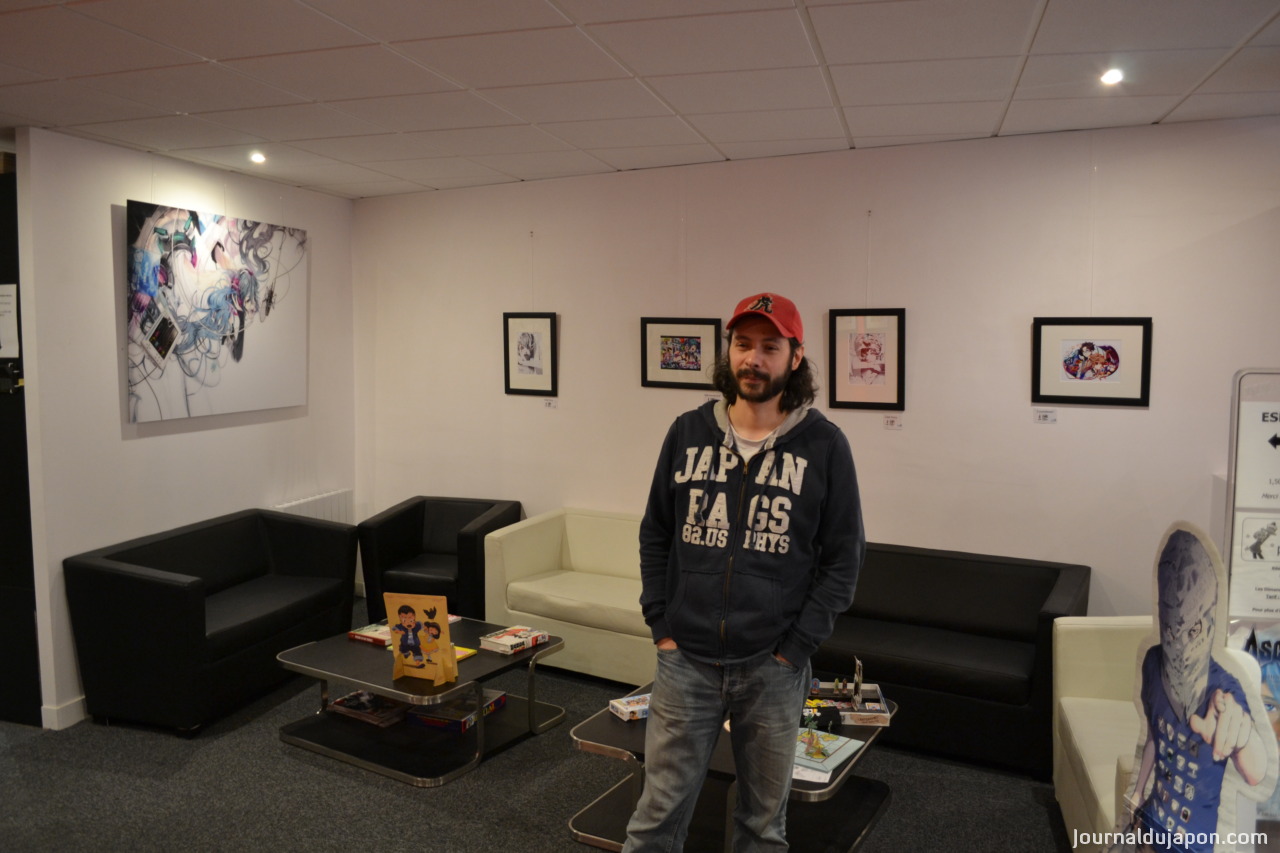 Leur partenaire de l’occasion était donc AOJI, une galerie d’art en ligne dédiée à l’illustration artistique de style et d’influence japonaise. « C’était la première fois que je collaborais avec eux. Il y a trois ans, je les avais rencontré à la Japan Expo, en tant que visiteur. Cependant, le projet de Manga Space n’en était qu’au stade préparatoire. Je n’ai donc réellement fait leur connaissance que récemment, et tout s’est bien passé, donc je pense qu’on réitèrera ce genre d’évènements. Les précédentes expositions étaient organisées directement avec l’artiste, ou avec leur éditeur.