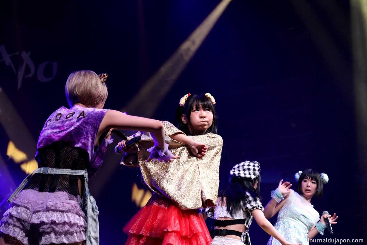 Pour ce qui est de la mise en scène, cette dernière était parfaitement maîtrisée, ce qui n’a rien d’étonnant lorsque l’on sait que le groupe se produit tous les jours dans un bar d’Akihabara. Elles n’ont d’ailleurs pas oublié leurs costumes si particuliers : pleins devants et vides derrière, comme attachés avec des scratchs.