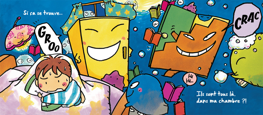 Peu à peu, le récit évolue en scène d’épouvante digne d’un The Grudge pour culottes courtes. En effet, lorsque vient le moment tant redouté du coucher, l’inquiétude de l’enfant laisse place à une vraie psychose, qui atteint son paroxysme avec l’apparition du Mons’trouille, association de tous ces êtres malfaisants qui peuplent la maison du petit garçon. On a alors la parfaite illustration de la détresse qui peut habiter certains enfants particulièrement sensibles.