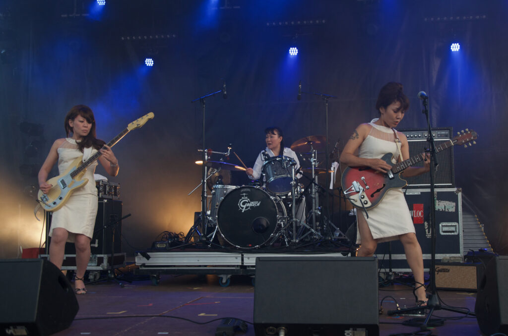 Artistes très attendues de la première édition du West Side Festival, les 5.6.7.8’s nous ont honorés de leur présence lors d’un concert bien énervé le 15 juin. Quelques heures avant de monter sur scène, elles nous accordé une interview. Alors que Zombie Zombie et ses batteries effectuent leurs balances à quelques mètres, nous retrouvons Yoshiko « Ronnie » Fujiyama, guitariste et chanteuse du groupe. Elle a préféré des vêtements paramilitaires et un cuir à sa tenue de scène et s’exprime dans un anglais plutôt maîtrisé, même si elle estime que son niveau est mauvais.