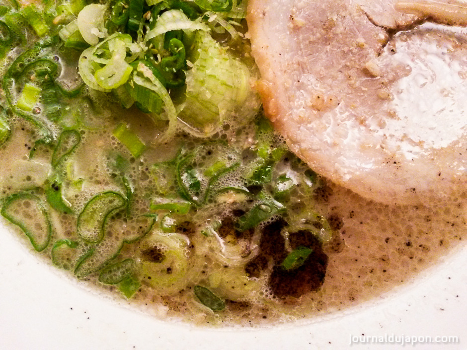 Très traditionnel, son Tonkotsu Ramen se veut à la fois simple et raffiné. Du porc, de la ciboule fraîchement hachée et des champignons au goût très prononcé finement tranchés en allumettes. Discrètes, quelques pousses de soja habillent le fond du bol. L’odeur qui s’en dégage est puissante et complexe. Une odeur provenant du bouillon Tonkotsu (à base d’os de porc) aux saveurs légèrement poivrées. Épais, son goût riche en saveurs explose en bouche, s’accordant parfaitement avec les ingrédients. Vos serviteurs sont sous le choc, nous venons de redécouvrir le ramen dans toute sa splendeur.