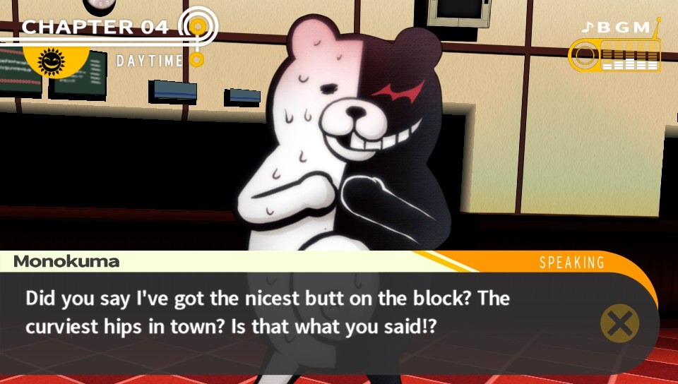 Voilà pas mal de critères intéressant. Joie : son identité visuelle est très travaillée. Le chara-design, outrancier et agressif, finit par plaire. Le jeu aime bien distiller des petits indices rétro à des endroits improbables. Les personnages sont représentés par des versions « plates » d’eux mêmes, et leurs poses sont irrésistibles. En plein procès, les arguments sont des balles qu’on s’envoie à la figure, tout tourne autour d’une ambiance étrangement colorée. A chaque nuit, Monokuma s’adonne à un étrange monologue, comme s’il faisait du rakugo. L’ambiance sonore est tout aussi réussie et identifiable. Les exécutions sont des petits sommets de stylisme – un comble ! Un vrai petit bazar joyeux et fier de lui.