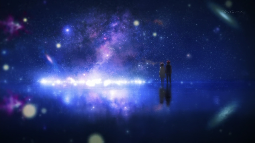 À travers le duo Yûta/Rikka et certains personnages secondaires, Chu2koi définit le chûnibyô comme notre capacité à rêver, à croire en un imaginaire. Vouloir nous l’enlever, comme la famille de Rikka et Yûta se forceront à le faire dans la saison 1, c’est ôter ce qui nous définit en tant qu’humains. Il est ainsi tout sauf étonnant qu’une fois que Rikka sera devenue non pas normale, mais normale telle que les autres l’entendent, elle nous apparaisse comme un pantin errant dans un monde qui n’est pas fait pour elle. En suivant son amie le temps de quelques minutes, Dekomori nous apparaîtra également d’une confondante banalité. Et la saison 1 de véhiculer ce propos à travers quelques scènes bouleversantes : l’épisode 11, qui fera office de révélation pour un Yûta tellement prêt à se conformer qu’il en perd son identité ; l’épisode 12 et Rikka découvrant enfin « les frontières invisibles » qu’elle cherchait depuis le début…