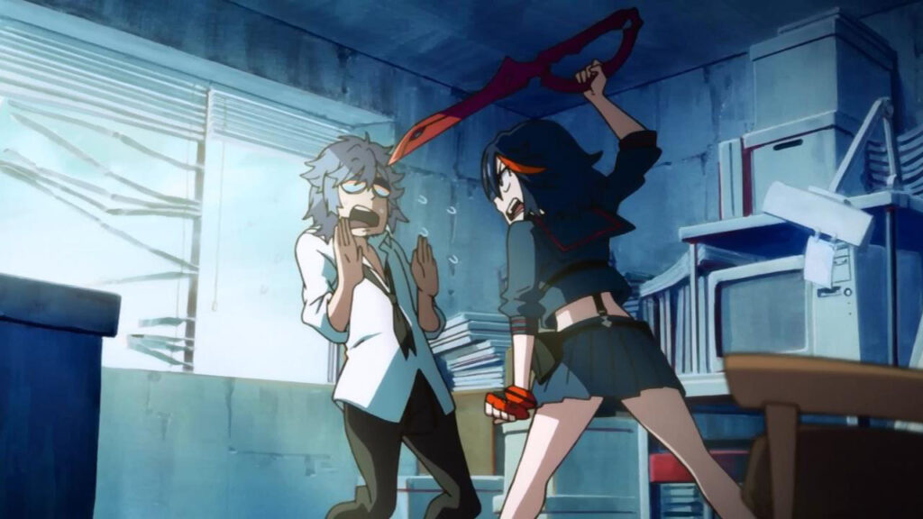 Marquant, il l’a été, certes, mais peut être pas toujours pour les bonnes raisons. Le scénario est assez simple : dans un Japon vaguement dystopique, Satsuki règne d’une main de fer sur l’académie Honnoji. L’héroïne, Ryûko, y arrive en délinquante avec son scissor blade, une moitié de paire de ciseaux géante. Ryûko n’aime pas Satsuki, cette dernière aurait tué son père. Telle Uma Thurman, cette dernière va monter les échelons dans l’école pour se venger, puis passer par le « conseil des quatre » local. Quatre personnages hauts en couleurs, tous présidents d’un club très spécial – ce qui se répercute dans leurs attaques et leur chara-design. Et justement : tous les élèves ont un uniforme qui, passé un certain rang, leur octroie des supercapacités.