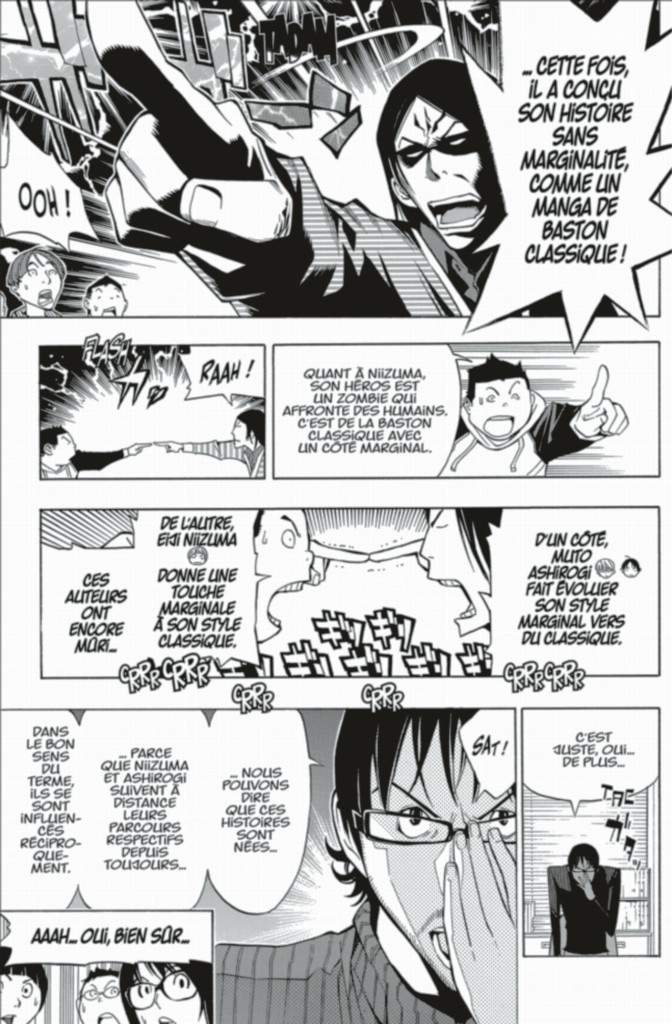 Face à toutes ces difficultés, le lecteur peut aussi réfléchir aux succès actuels, comme Naruto, Fairy Tail et One Piece, dont les talentueux auteurs durent depuis des années tout en conservant leur ligne de conduite initiale. Pour en revenir au manga, sachez qu’il expose d’ailleurs différents profils de mangakas : ceux qui font ce qu’ils souhaitent, de manière instinctive comme Hiramaru et Eiji et ceux qui réfléchissent et construisent leur scénario en pesant chaque éléments, comme Ashirogi Mûto, Aoki Ko et Nakaï. Les premiers semblent nés pour produire des shônens idéaux, alors que les seconds jouent souvent avec les codes du genre, en étant à la limite éditoriale du magazine, comme a pu l’être Death Note à son époque dans la réalité. Entre exceller dans un genre et le renouveler en repoussant ses frontières, le débat dans Bakuman est permanent.