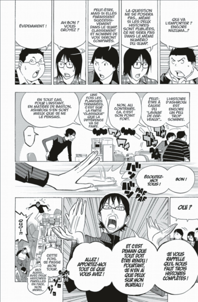 Nanamine part du principe que les éditeurs brident trop les auteurs, ce qui ne leur permet pas d’exploiter tout leur potentiel. Son mépris envers ses gêneurs et les codes du Shônen Jump permet de faire un parallèle intéressant entre le système qu’il va créer pour « vaincre » notre duo de mangakas et celui du magazine. La technique de Nanamine ne s’embarrasse pas du barrage qu’est l’éditeur, ce qui lui permet de se libérer des entraves du shônen qui finissent par tous se ressembler, pour finalement ne jamais sortir du lot.