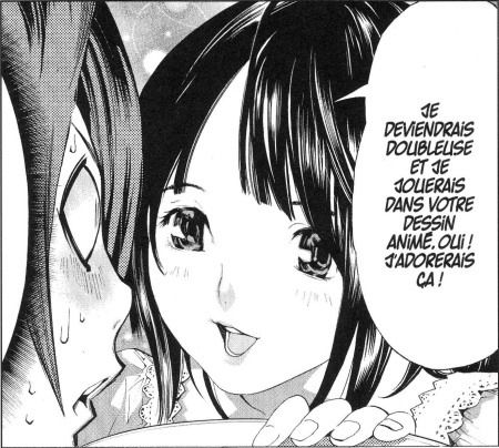 Heureusement, in fine, un autre couple parvient à ne pas s’enliser dans la guimauve : celui d’Aoki Ko et d’Hiramaru. Cette relation est rafraîchissante à souhait car débute sur un stratagème aussi drôle que machiavélique de Yoshida, le tantô d’Hiramaru, qui le manipule pour qu’il continue d’arrache-pied sa carrière de mangaka. Les choses ne se dérouleront évidemment pas comme l’avait prévu Yoshida, ce qui sera l’occasion pour Bakuman de livrer sa meilleure prestation humoristique.