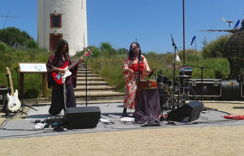 Le samedi s’annonce différent. Les nuages de la veille sont loin. Le soleil brille, ébloui et fait rougir les touristes à la peau claire. Le premier concert est donné par Emiko Ota et sa formation, le KiriSute Gomen (composé uniquement du guitariste/bassiste Julien Omeyer pour l’occasion), dans l’amphithéâtre du Jardin du Vent. Le cadre est parfait : la percussionniste/batteuse/chanteuse ouvre la performance avec des fûrin, ces carillons japonais que l’on suspend en été, et que le vent fait tinter. Débuté devant un public d’abord clairsemé (la digestion, sûrement), le concert attire peu à peu les curieux en ballade. Le mélange des chants traditionnels dans une langue que finalement peu de festivaliers comprennent à des sonorités surf/psyché/punk rock et rockabilly intriguent et plaisent. Ajoutez à cela des musiciens en yutaka pour un dépaysement complet.