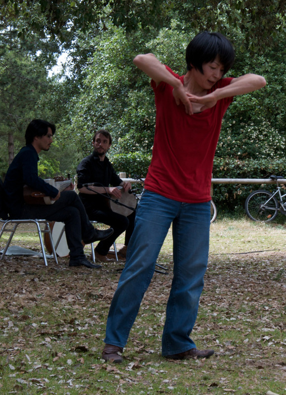 Peu de temps après, on poursuit l’après-midi devant la création chorégraphique et musicale du duo Keiko Sato (à la danse) et Kengo Saito (au sitar). Ce dernier est accompagné par Antoine Morineau aux percussions. Le mélange est étonnant : la musique est résolument orientale (du Proche comme de l’Extrême-Orient, par ailleurs) et contraste avec la danse énergique contemporaine de Keiko Sato, qui joue avec son environnement. Mais il y a bel et bien harmonie entre les deux arts : on ressent la grâce tant dans les sonorités aériennes de l’instrument à cordes que dans les mouvements de la danseuse. Les deux éléments se répondent et se complètent. Le public, mis à contribution, est conquis.