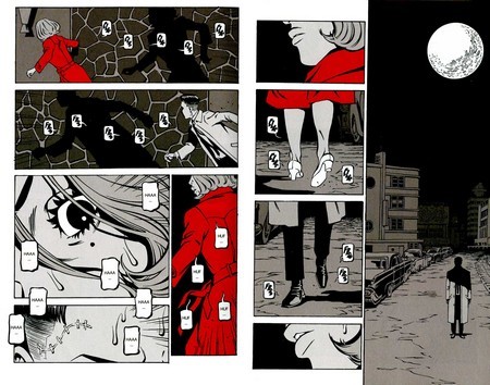 Bien sûr celle qui nous intrigue le plus est la fameuse Kiwako Komiyama. Les premières pages s’ouvrent sur elle : un jeu de noir, de blanc et de rouge. Comme pour attirer l’attention, comme pour nous indiquer que cette femme deviendra également notre obsession la plus profonde tout au long des tomes. Et à juste titre : quand la narration traîne un peu en longueur, on la cherche, on l’attend, on s’essouffle. On s’interroge : Mais où est-elle ? Qui est cette femme, que lui est-il vraiment arrivé… Et même quand on finit par la revoir et qu’on pense que Sata la tient, elle finit toujours par s’échapper un peu comme cette vérité qu’on croit découvrir sur elle. On ne peut s’empêcher de se demander à quelle réalité se fier, à quel moment on a été aspiré dans la spirale de Kaneko, dans cette lune humide et dans ce manteau rouge.