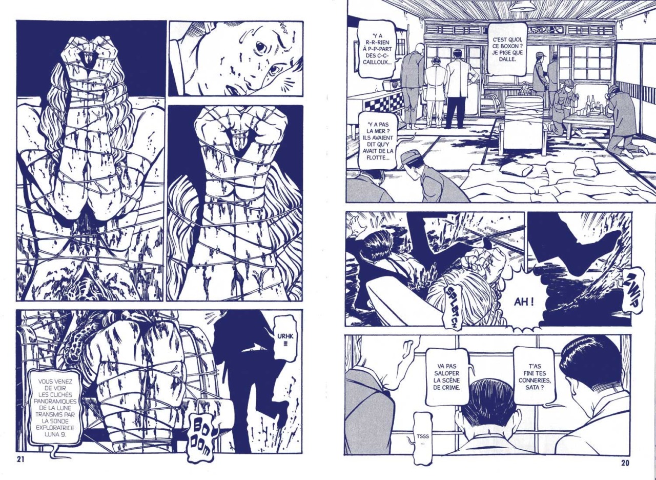 Dès le début, le décor est posé : Atsushi Kaneko nous précipite dans une ambiance mi-réaliste mi- sordide dans laquelle le lecteur ne sait pas quand il sombrera à son tour dans la folie instaurée par l’auteur.