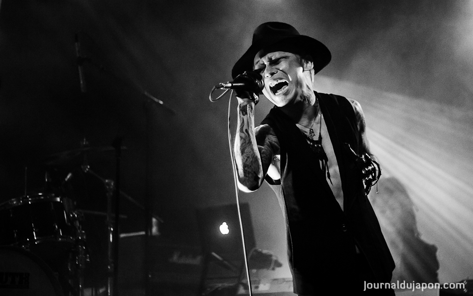 Un live de Sukekiyo, c’est plus qu’un concert. C’est une expérience mystique. N’attendant pas grand-chose de cette soirée, votre servante en a été toute retournée, subjuguée par une prestation qui tenait plus du voyage initiatique vers des contrées musicales lointaines et exaltées. A peine entré sur scène, le groupe impose déjà une prestance certaine, adoubé d’un Kyo plus mystérieux et plus fervent que jamais. Une ferveur totalement dédiée à sa musique, viscérale, poétique, qui pénètre notre conscience dès les premières notes.