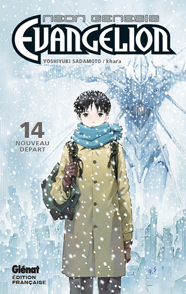 Julien : 16 ans ! Déjà 16 longues années que le premier tome du manga tiré de la série animée culte Evangelion a été publié par Glénat (alors en sens de lecture occidental et sans jaquettes, c’est dire si l’eau a coulé sous les ponts). C’est donc une patience d’ange qu’il aura fallu à ses lecteurs avant la sortie de ce 14e et dernier volume, en simultanée avec le Japon. Le prix à payer, lourd, pour avoir droit à une adaptation dessinée de main de maitre par le chara designer et illustrateur de la série lui-même : Yoshiyuki Sadamoto.
